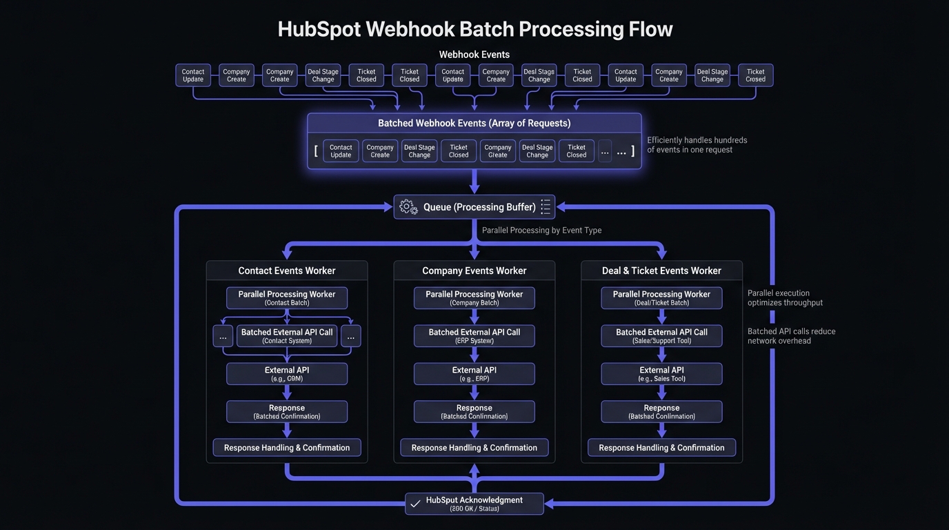 HubSpot batches events for efficiency. A single request may contain up to 100 events, especially during bulk imports or workflows. Bulk imports of 1,000 contacts can trigger 1,000+ webhook notifications simultaneously.