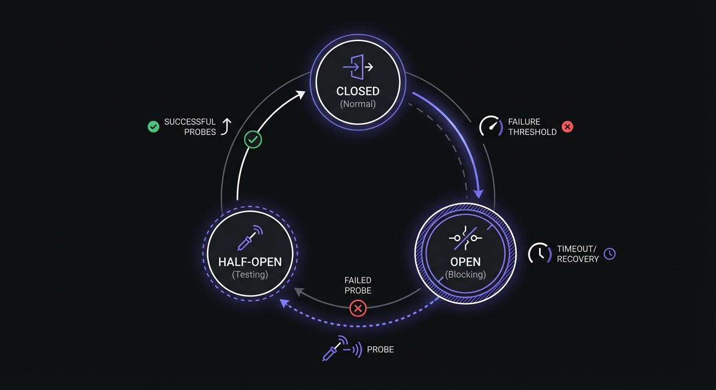 A circuit breaker monitors endpoint health and "trips" when failures exceed a threshold, stopping requests for a cooldown period. After cooldown, it enters half-open state, allowing test requests to probe recovery.