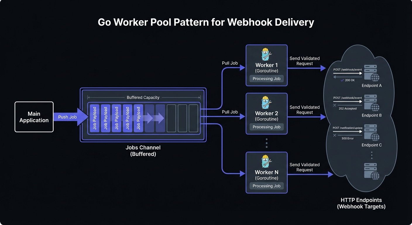 Learn how to send webhooks with Go using the standard library. This hands-on tutorial covers JSON marshaling, HMAC-SHA256 signatures, HTTP client configuration, timeouts, retries, and production-ready patterns.
