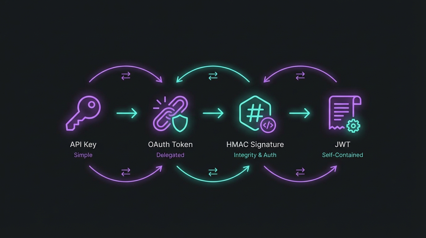 HMAC-SHA256 provides strong security and straightforward implementation for most applications. JWT offers flexibility when you need embedded claims, while mTLS serves highly regulated environments.