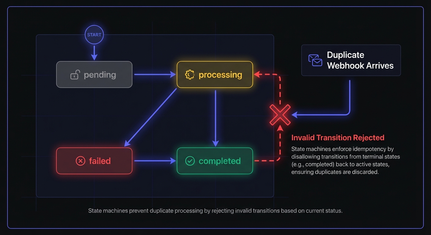 An operation is idempotent when performing it multiple times produces the same result as doing it once. For webhooks: processing the same event twice should have exactly the same effect as processing it once.