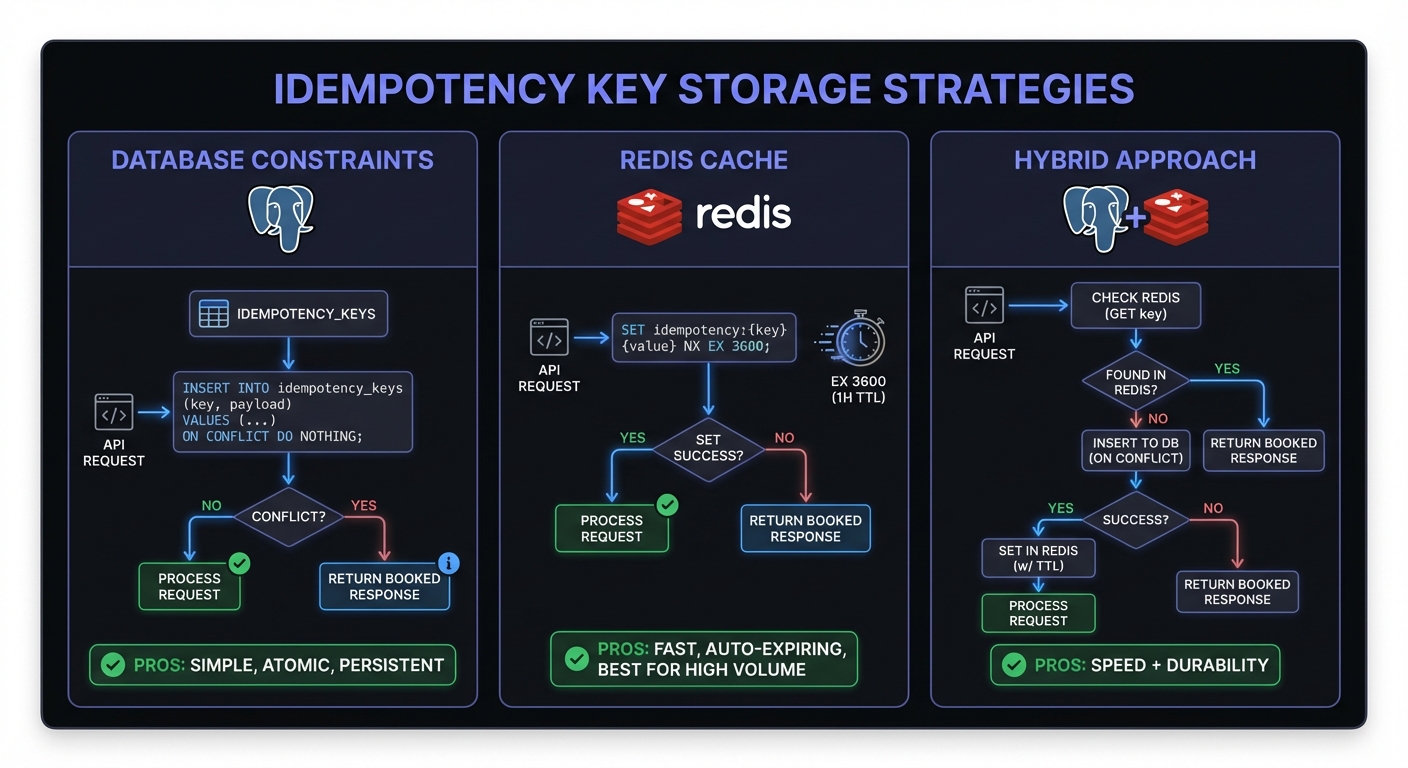 - Deduplication: Track processed event IDs with database constraints or Redis