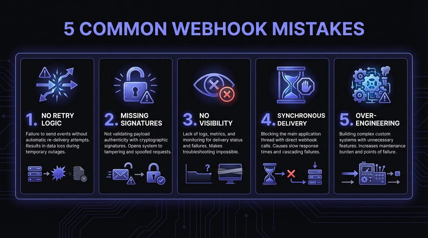 Learn the most common webhook mistakes that plague early-stage startups—from missing retry logic to over-engineering—and how to avoid them before they cost you customers.