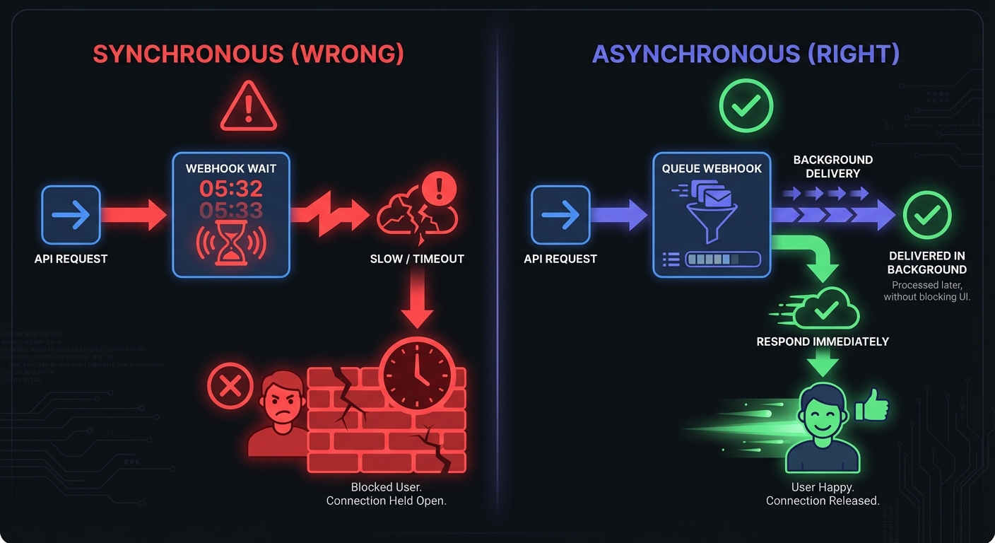 Synchronous webhook delivery in your API request path means response time depends on the customer's server. Slow or down endpoints slow or timeout your entire API.