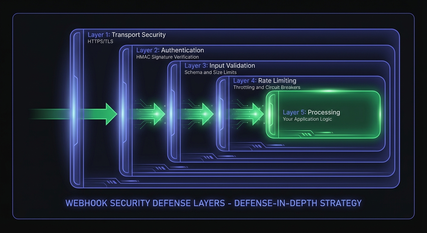 Never trust incoming data. Validate and sanitize webhook payloads before processing. If building delivery systems, review SSRF attack prevention for malicious destination URLs.