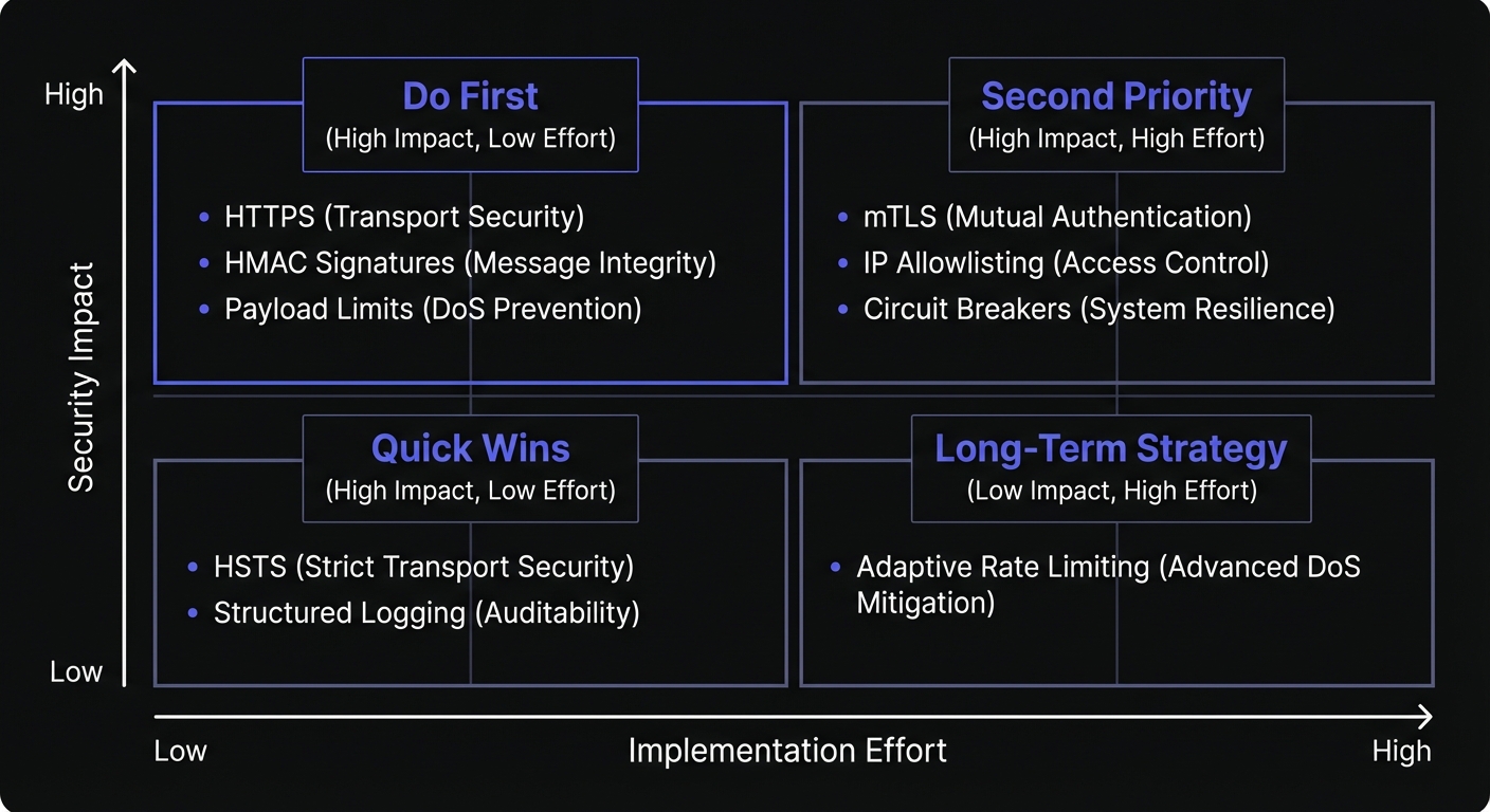 A comprehensive, actionable security checklist for production webhook endpoints. Covers transport security, authentication, input validation, rate limiting, logging, and error handling with priority levels and code examples.