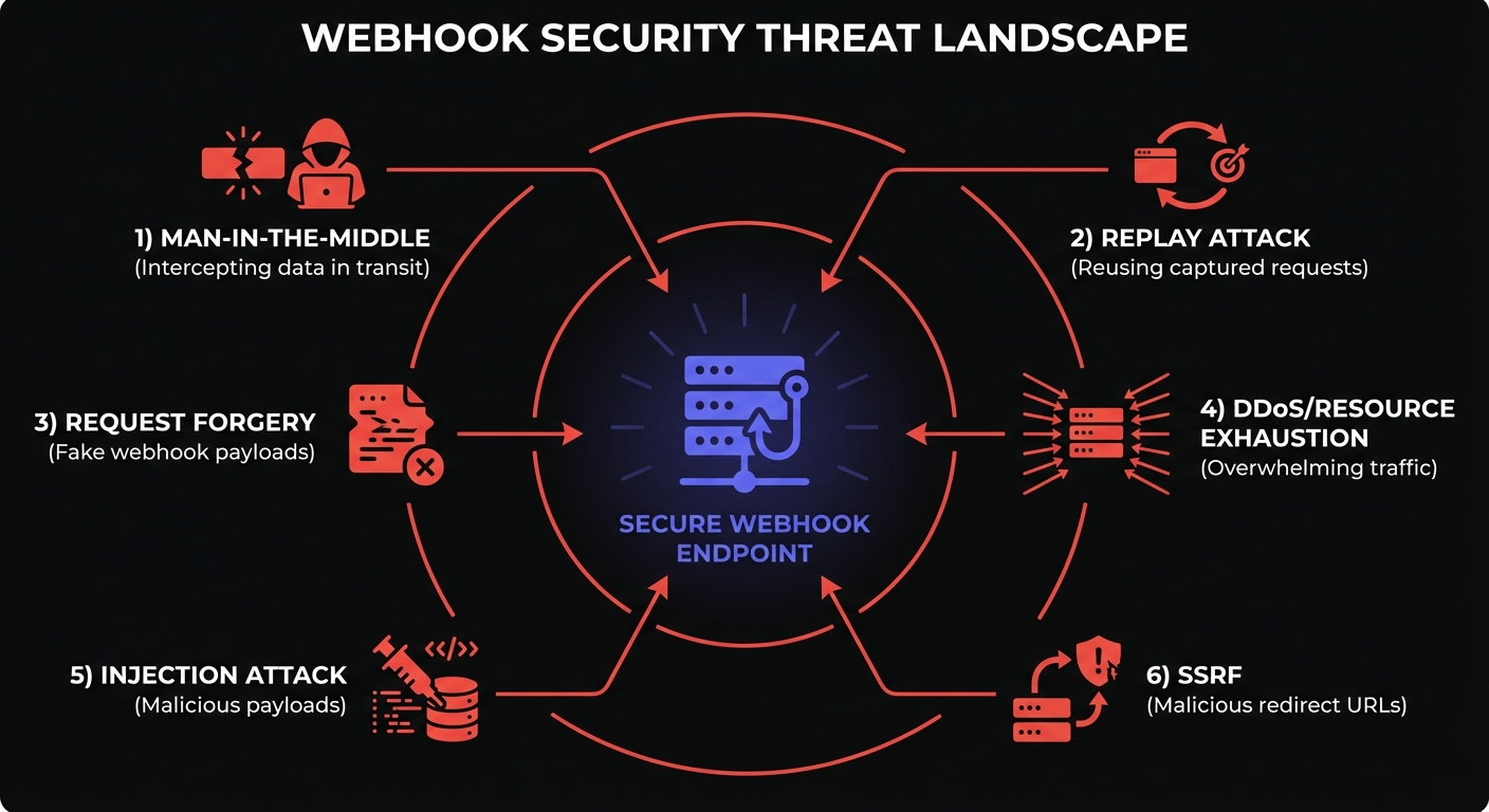 Webhook endpoints are publicly accessible URLs that accept POST requests from external services. Without proper security controls, they become attack vectors for data injection, denial of service, and unauthorized access.